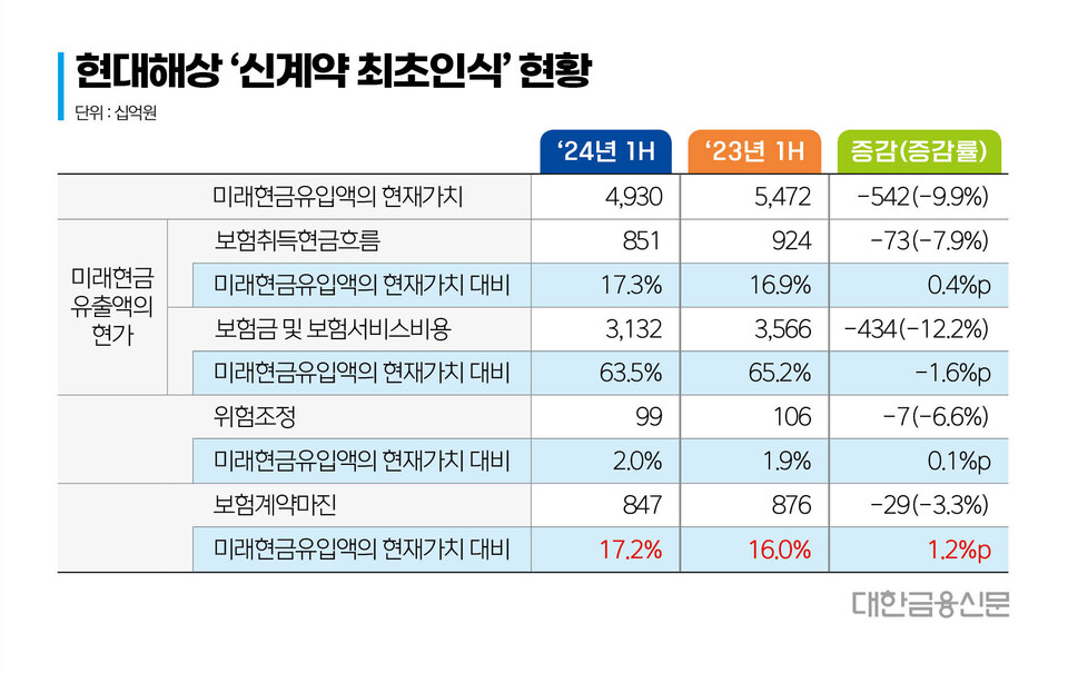 22일 현대해상의 신계약 최초인식 흐름에 따르면 올 상반기 미래현금유입액의 현재가치 대비 보험계약마진(CSM) 비중은 17.2%다. 지난해 동기 대비 1.2%포인트(p) 개선됐다.