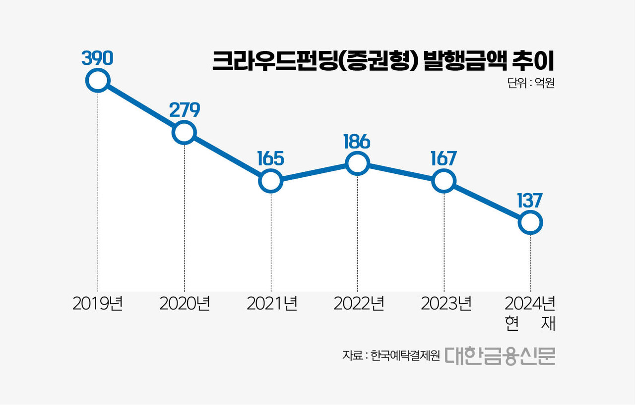 크라우드펀딩 사업을 지원하는 한국예탁결제원에 따르면 크라우드펀딩(증권형) 발행금액은 지난 2019년 390억원을 정점으로 내리막길을 걷고 있다. 지난해에는 167억원을 기록해 4년 전에 비해 57.2% 줄었다.