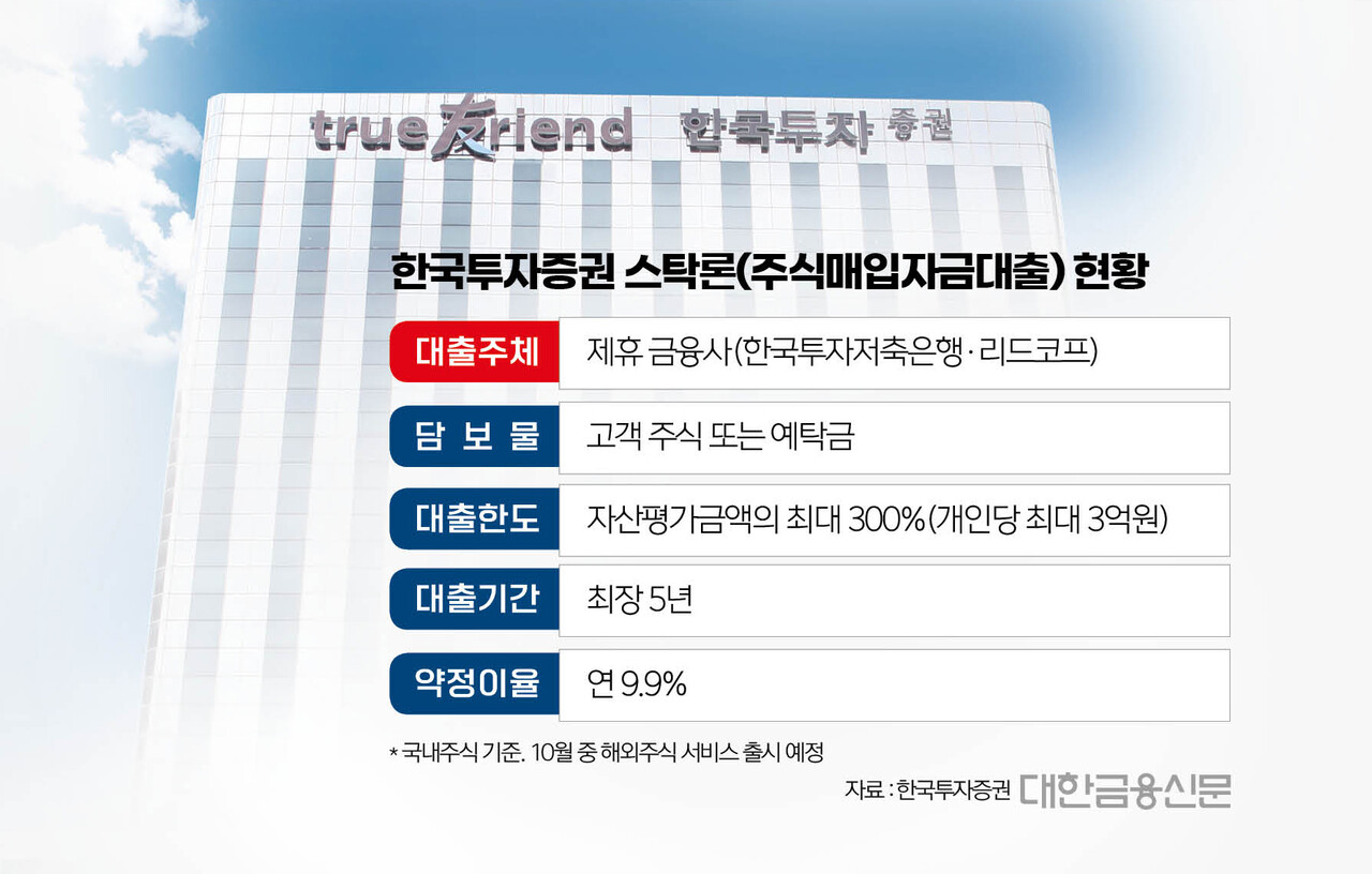 한투증권 관계자는 “대출제휴기관과 대출한도 등 그 밖의 구체적인 조건은 현업 부서에서 준비 중”이라고 전했다.