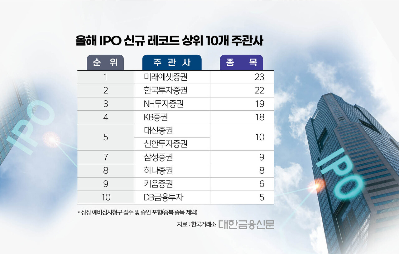 이어 △한국투자증권 22개 △NH투자증권 19개 △KB증권 18개 순이었다. 미래에셋증권을 포함한 이들 초대형 IB의 실적 비중은 올해 IPO 도전 기업의 62%를 차지한다.