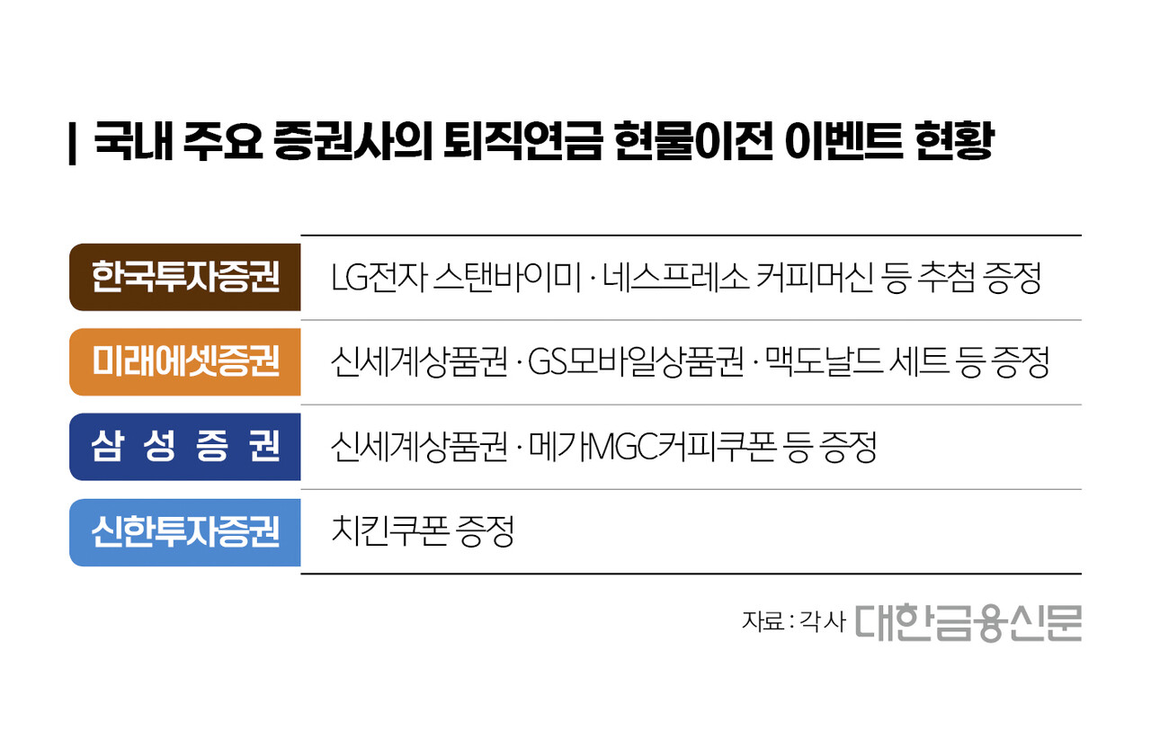 증권가가 퇴직연금 현물이전 고객을 잡고자 갖가지 경품을 내걸고 있다.