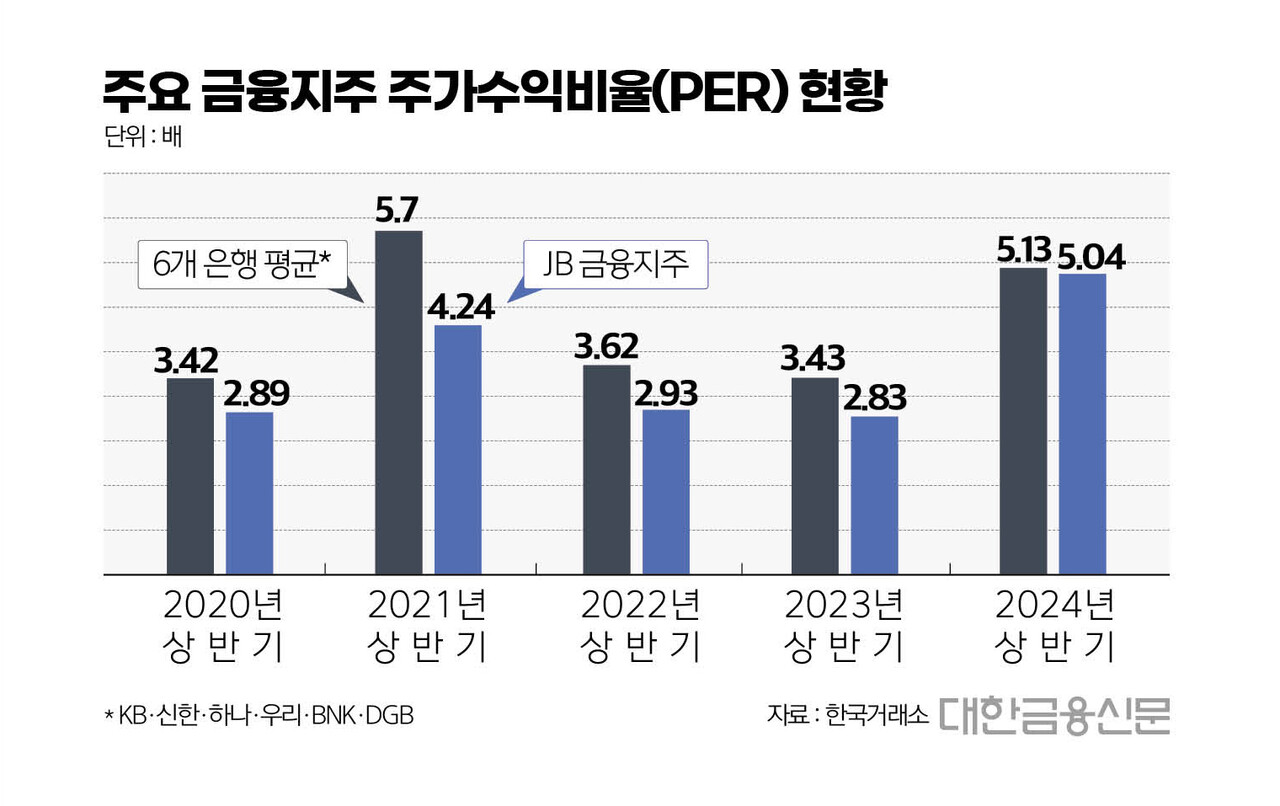 지난 2020년 이후 매해 상반기 말 기준 JB금융지주의 PER은 △2020년 2.89배(7개사 중 5위) △2021년 4.24배(7위) △2022년 2.93배(5위) △2023년 2.83배(6위)로 집계됐다.