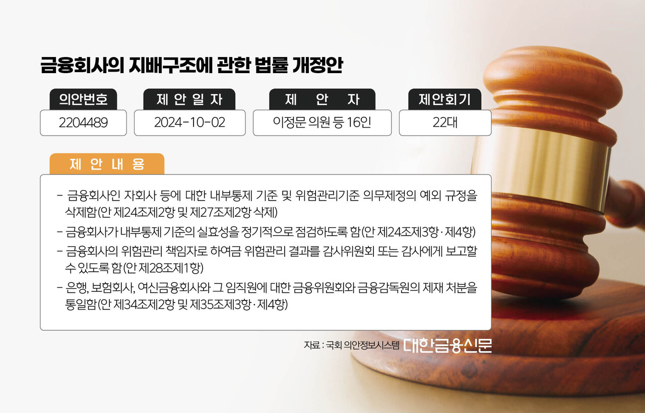 8일 국회 의안정보시스템에 따르면 정무위원회 소속 이정문 더불어민주당 의원은 지난 2일 ‘금융회사의 지배구조에 관한 법률 일부개정법률안(의안번호 2204489)’을 발의했다.