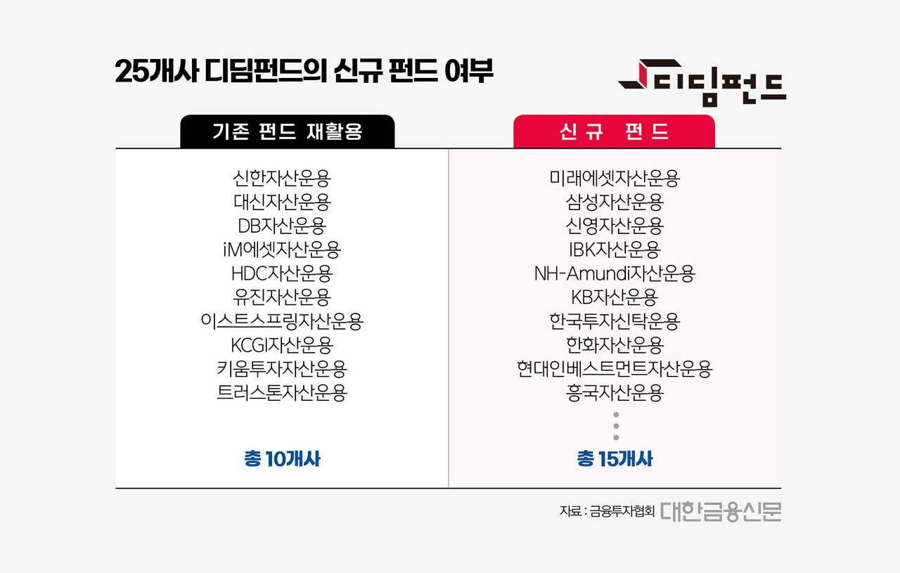 실상을 들여다보면 디딤펀드 론칭에 맞춰 새로운 펀드를 선보인 운용사는 15개사뿐이다. 나머지 10개사의 경우 기존에 출시한 펀드를 재활용했다.