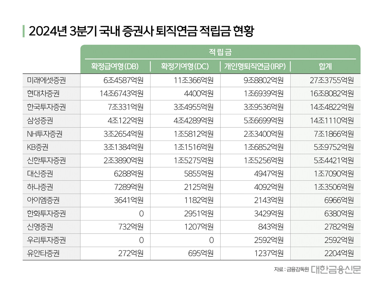 올해 3분기 말 기준 증권사 퇴직연금 1위는 미래에셋증권으로 총 27조3755억원을 기록했다. 직전 분기 대비 7628억원 증가했다.