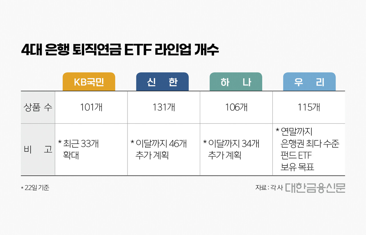 23일 은행권에 따르면 KB국민·신한·하나·우리 등 4대 은행은 현재 101~131개의 ETF 라인업을 갖추고 있다. 이들 은행은 조만간 ETF 개수를 30~40여개 더 보강할 예정이다.