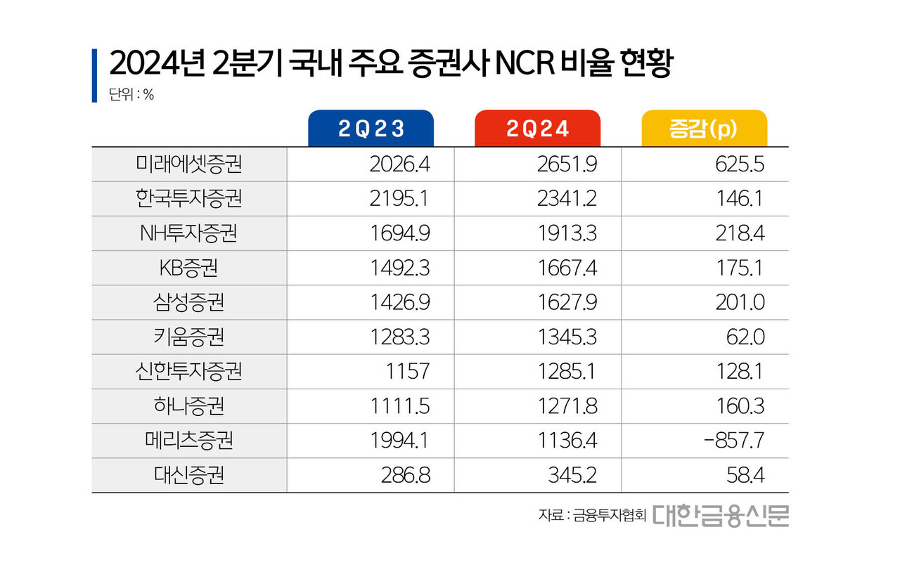 올해 2분기 말 기준 자기자본 3조원 이상 국내 증권사 중 가장 높은 순자본비율(NCR)을 기록한 증권사는 미래에셋증권으로 2651.9%를 기록했다.