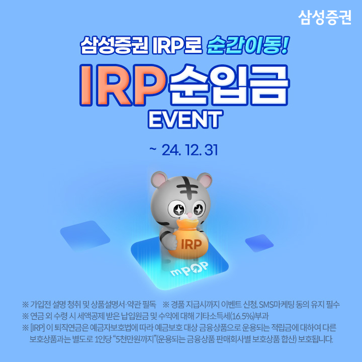 삼성증권이 ‘IRP 순입금 이벤트’를 오는 12월 말까지 진행한다고 28일 밝혔다.