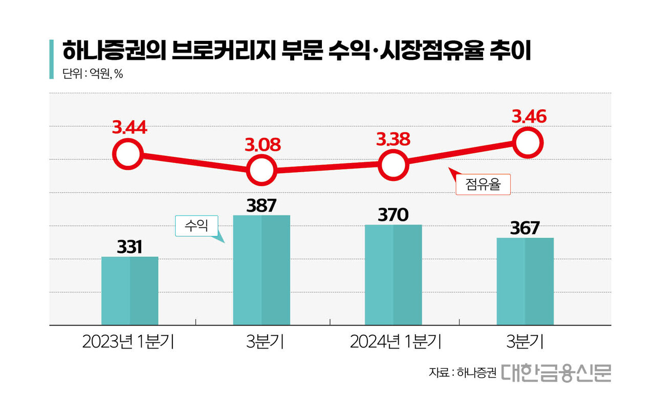 하나증권의 리테일 사업 중 브로커리지 부문은 경쟁사에 비해 특히 뒤처지는 편이다. 하나증권의 브로커리지 수익 점유율은 3%대 수준에 머물고 있다. 반면 브로커리지 상위권 증권사로 꼽히는 키움·미래에셋·한국투자증권 등은 매년 10% 이상 점유율을 확보하는 상황이다.