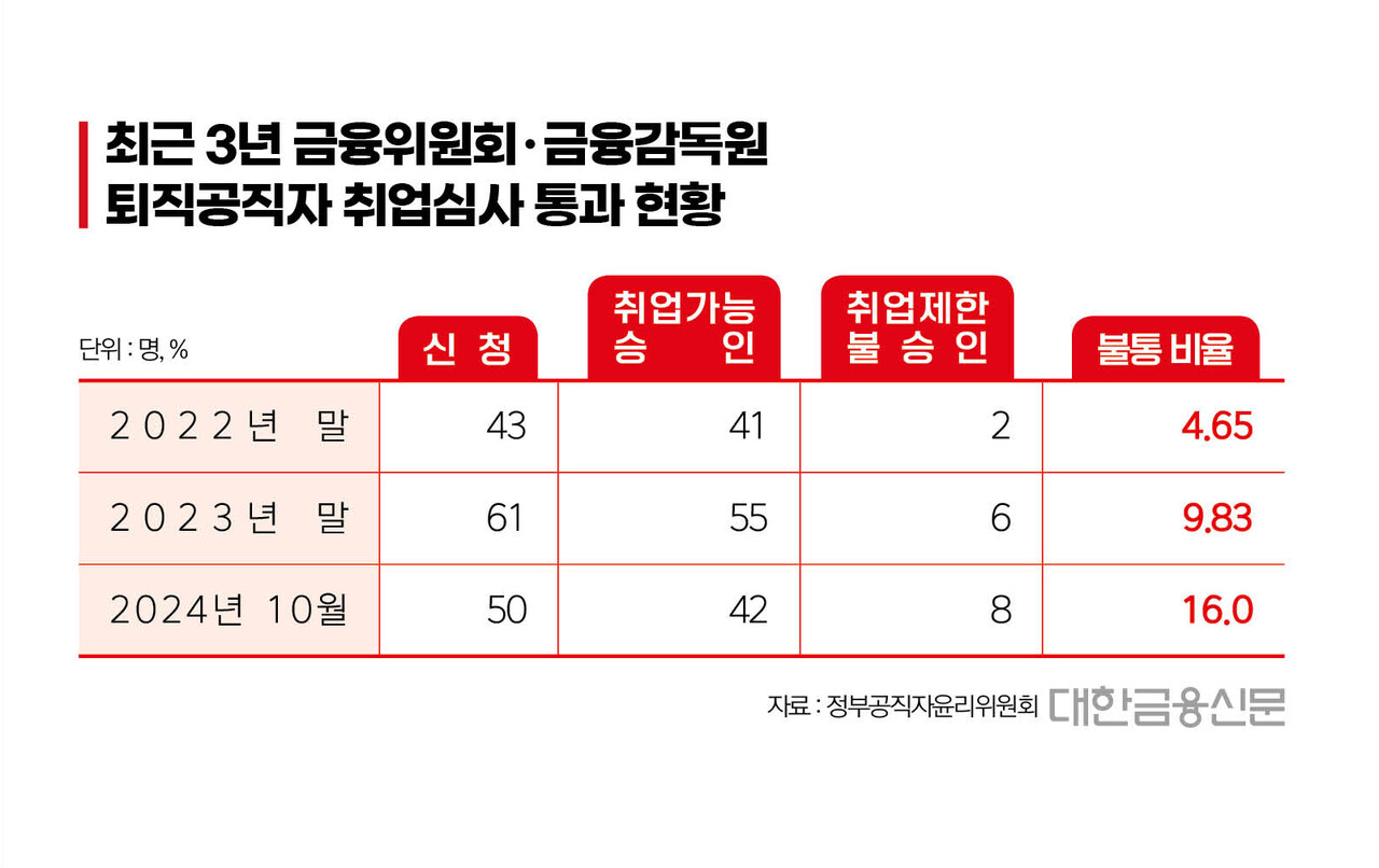 금융당국 퇴직공직자 재취업심사 문턱이 점차 높아지고 있다.