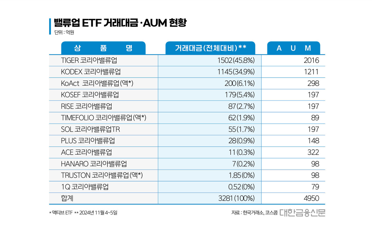이 중 미래에셋운용의 ‘TIGER 코리아밸류업’과 삼성운용의 ‘KODEX 코리아밸류업(이하 생략)’에 각각 1502억원(45.8%), 1145억원(34.9%)이 거래됐다. 두 상품의 거래 규모가 전체의 80%를 넘었다.