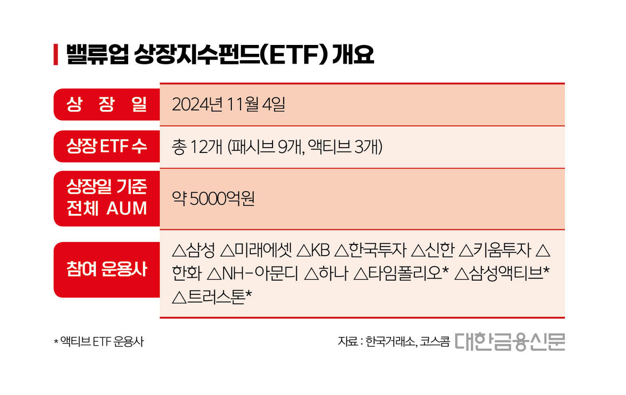 6일 업계에 따르면 지난 4일 한국거래소는 밸류업 프로그램의 일환으로 밸류업 ETF 12종(패시브 9종, 액티브 3종)을 시장에 동시 상장했다. 총 12개 운용사가 참여했으며, 초기 순자산(AUM)은 약 5000억원 수준이다.