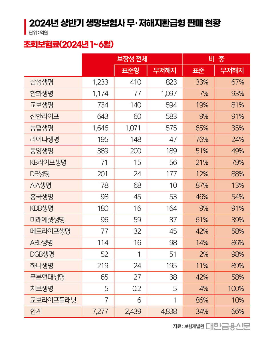 전체 보장성보험의 초회보험료는 7277억원이다. 무해지보험 비중은 66%다.