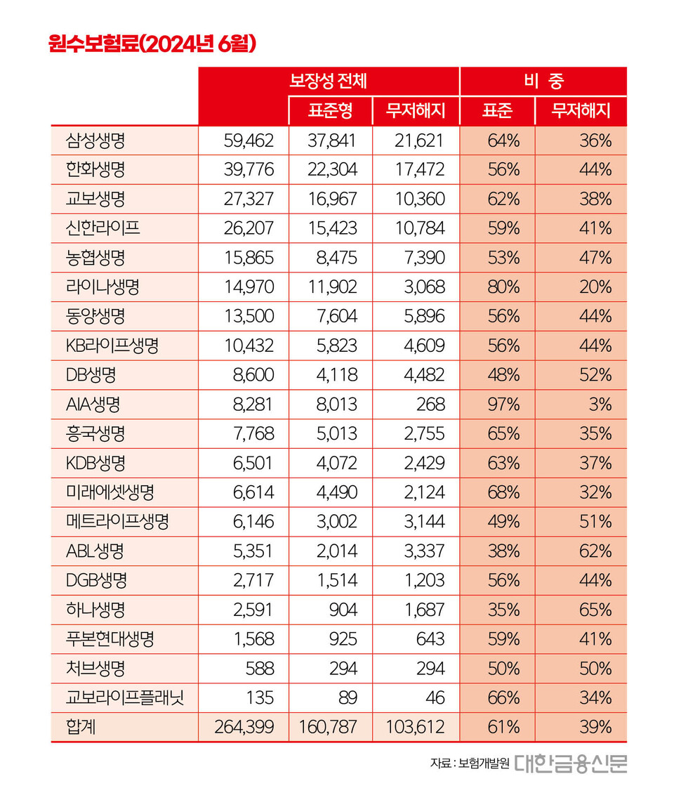 원수보험료 기준 무해지보험의 비중은 생보사와 손보사 각각 39%, 17%다.