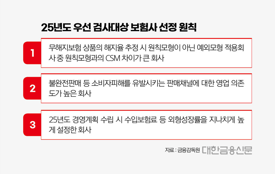 한편 금감원은 예외모형 적용사 외에도 불완전판매 등 소비자피해를 유발하는 판매채널에 대한 영업의존도가 높은 회사도 집중검사 우선대상자로 선정할 방침이다. 이밖에 내년도 경영계획 수립 시 수입보험료 등 외형성장률을 높게 설정한 회사도 집중검사 대상이다.