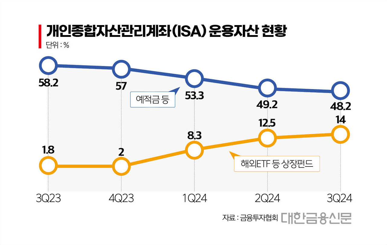 12일 금융투자협회에 따르면 지난 3분기 말 기준 전체 ISA 계좌 내 운용자산 중 ‘해외 ETF 등 상장 펀드’의 편입 비중은 14%(4조3988억원)로 집계됐다.