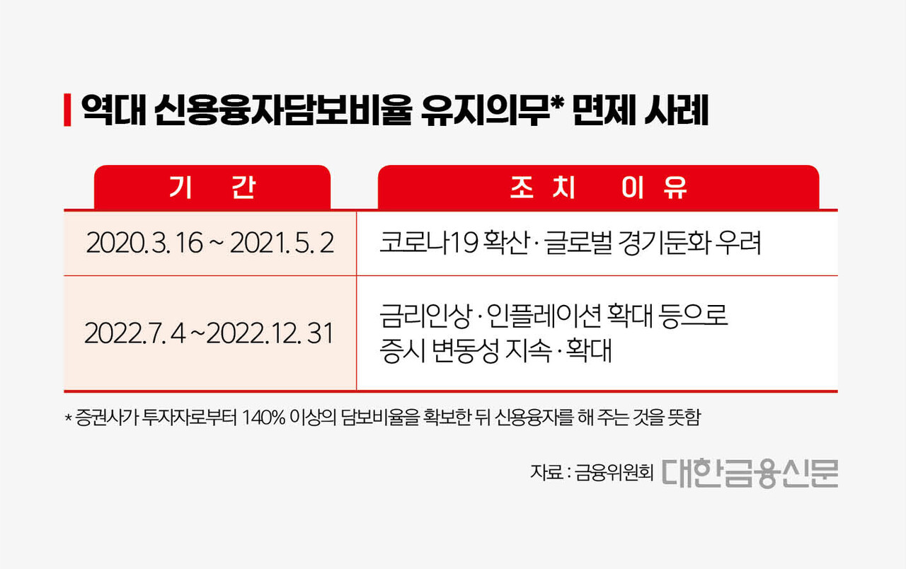 실제로 지난 2022년 7월 4일부터 12월 31일까지 신용융자담보비율 유지의무가 면제됐으나 같은 기간 코스피지수는 2310.73에서 2236.40, 코스닥지수는 733.35에서 679.29로 각각 3.21%, 7.37% 감소했다.