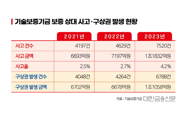 21일 기술보증기금이 공개한 공공데이터 자료에 따르면 지난해 일어난 보증사고는 7520건으로, 사고금액은 1조18432억원에 달했다. △2021년 4197건·6693억원 △2022년 4629건·7197억원에서 지속 증가추세다. 이 기간 사고율도 2.5%에서 4.2%로 1.7%포인트 뛰었다.
