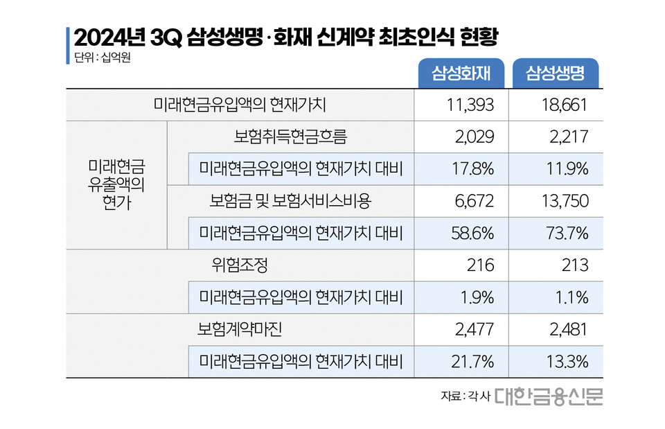 신계약 마진율 역시 삼성화재가 앞섰다. 삼성화재에 따르면 올 3분기 누적 기준 미래현금유입액의 현재가치 추정치 대비 CSM 비중은 21.7%로 삼성생명(13.3%)보다 8.4%포인트(p) 높다.