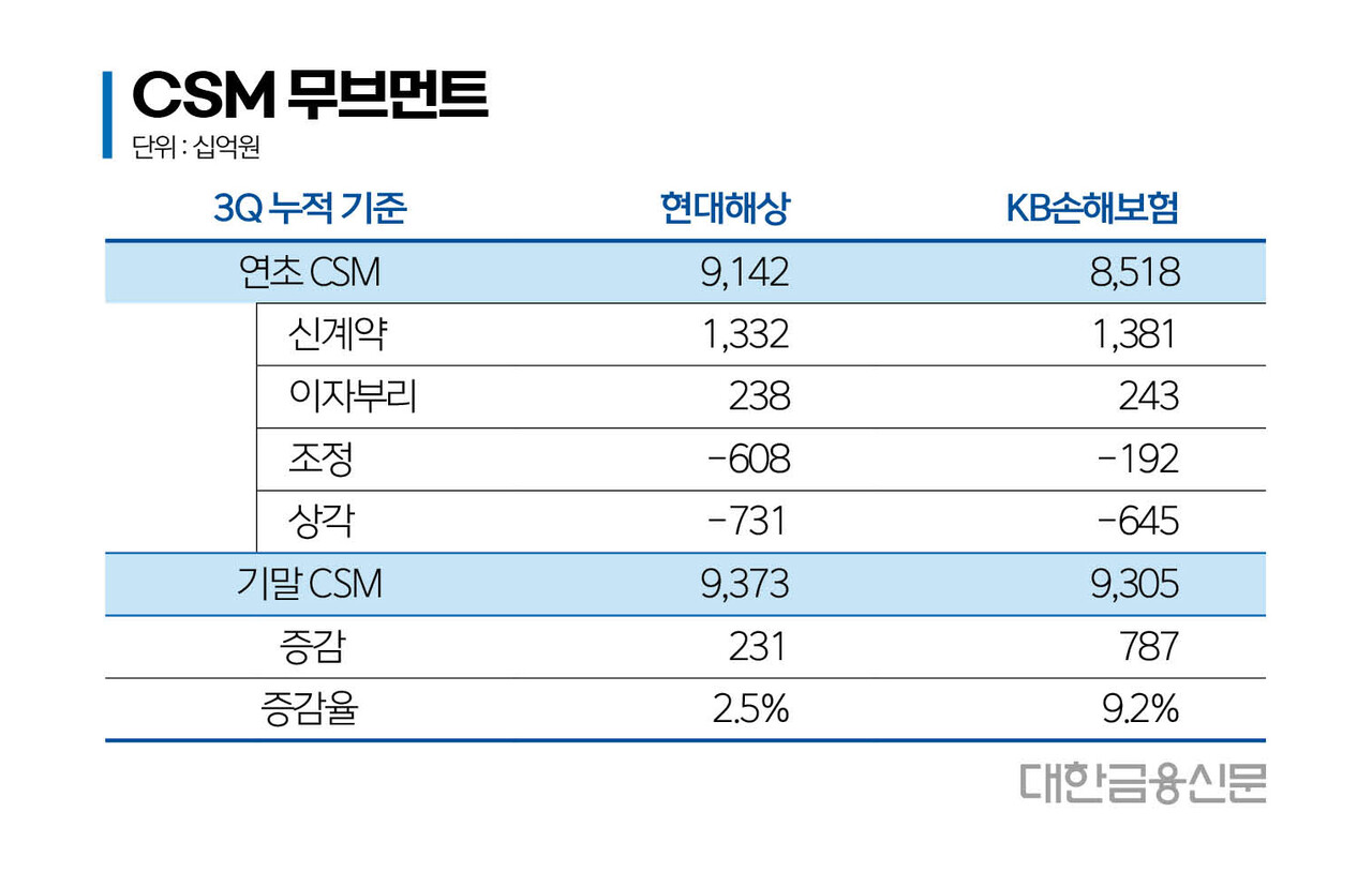 연초 현대해상과 KB손보의 CSM 잔액 격차는 6240억원이었지만, 3분기 말 현재 680억원까지 줄어든 상태다.