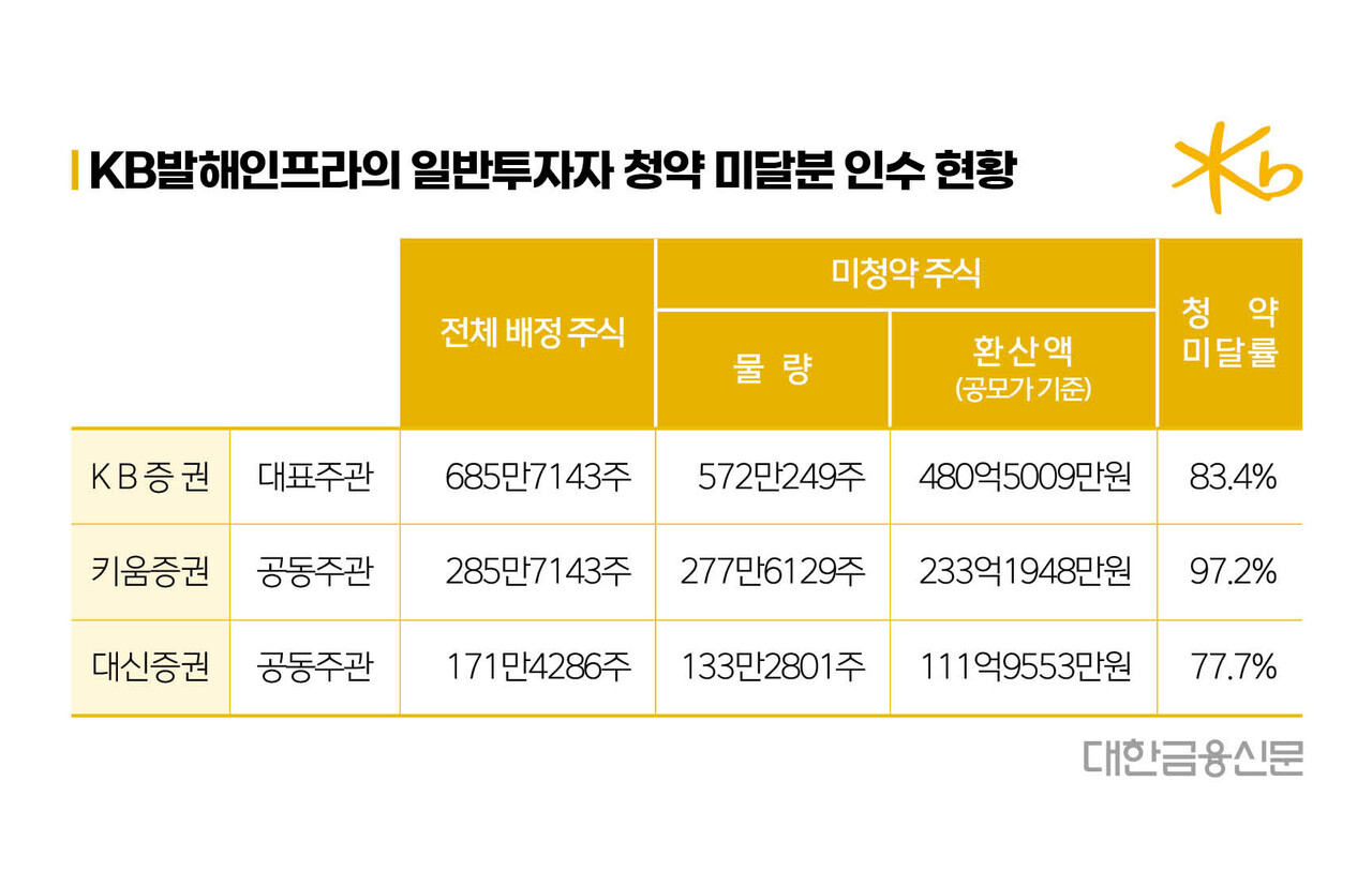 KB·키움·대신 등 3개 증권사가 주관사 책임 차원에서 떠안은 KB발해인프라투융자회사(KB발해인프라) 미청약 물량의 원금 회수 여부가 안갯속에 갇혔다.
