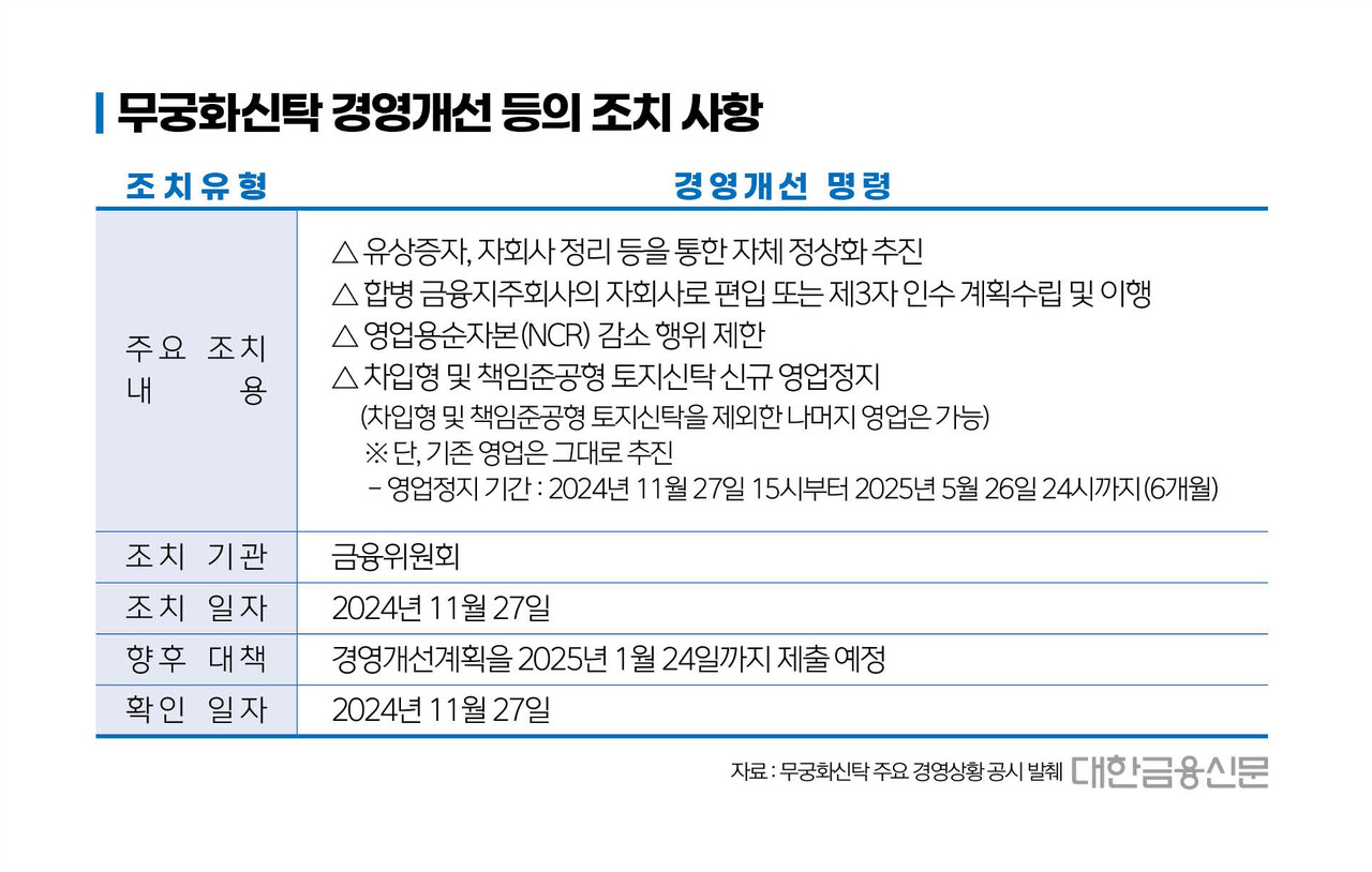 앞서 금융위원회는 지난달 27일 무궁화신탁에 대해 경영개선명령을 부과했다. 원인은 영업용순자본비율(NCR) 미달이다.