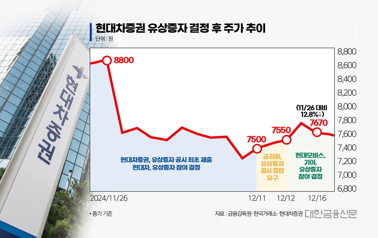 현대차증권의 대주주인 현대자동차·현대모비스·기아 등이 유상증자에 청약한다고 밝혔지만 투자자 분노는 사그라들지 않았다. 금감원도 이를 의식한 듯 지난 11일 현대차증권에 유상증자에 대한 정정신고서를 제출하라고 요구했다. 현대차증권은 내년 3월 10일까지 보완된 신고서를 내야 유상증자를 이어갈 수 있다.