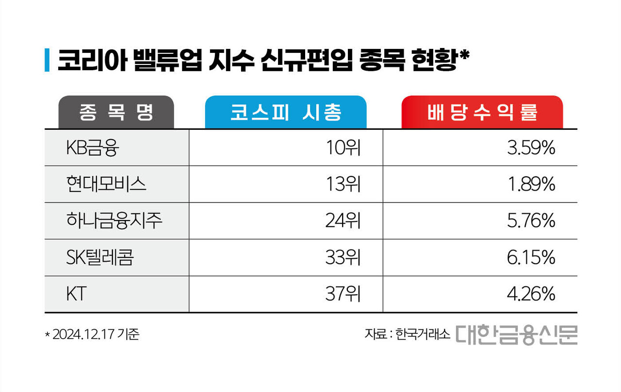 지난 9월 24일 밸류업 지수 발표 이후 지난 6일까지 밸류업 공시를 이행한 기업 중 밸류업 지수에 미편입된 기업은 총 43사다. 이 중 △KB금융 △현대모비스 △하나금융지주 △SK텔레콤 △KT가 추가로 지수에 합류하게 됐다.