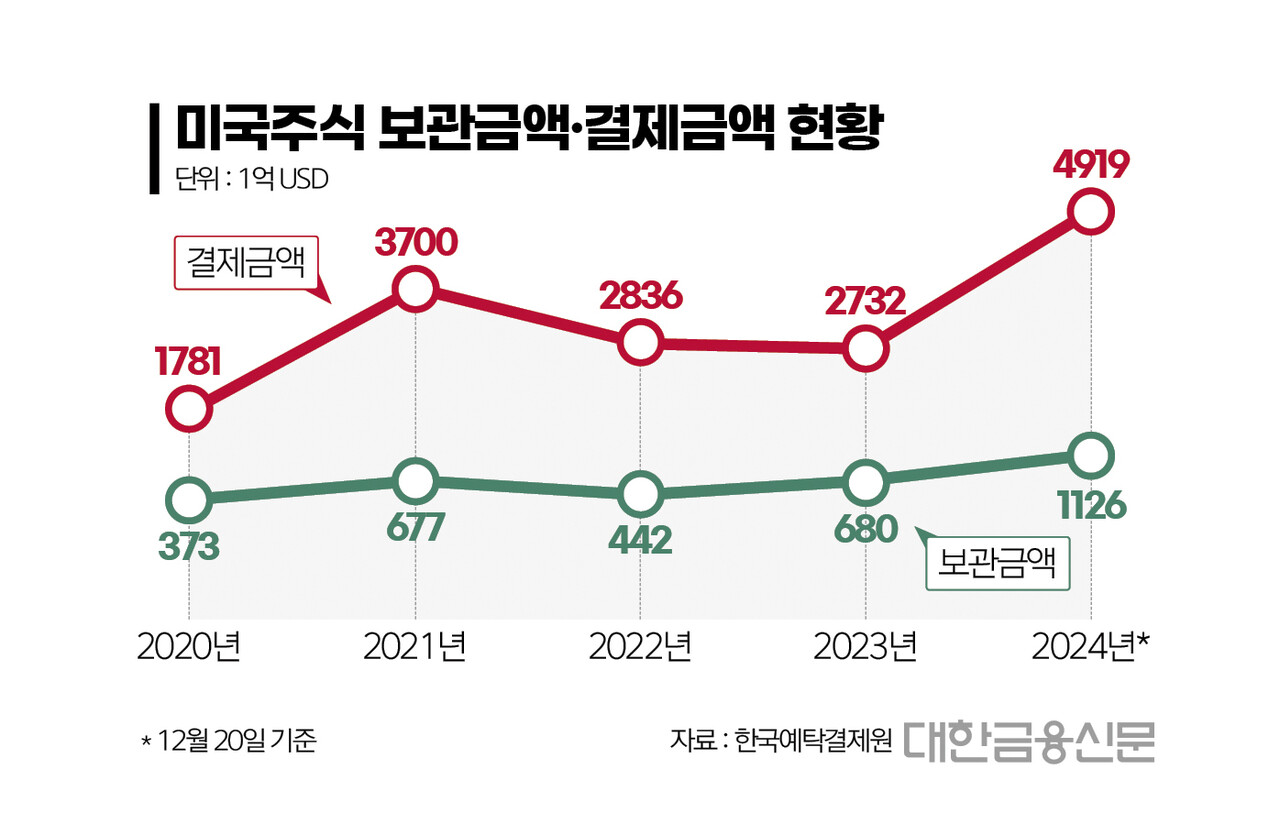 한국예탁결제원에 따르면 올해 초부터 지난 20일까지 국내 투자자(개인·기관)의 미국주식 결제(거래)금액은 4919억달러를 기록했다. 지난 2020년(1781억달러) 대비 3배(276.2%) 가까이 규모가 커졌다. 동 기준 보관금액도 1126억달러로 사상 최대치를 찍었다.