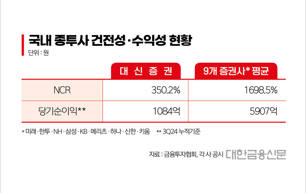 건전성 개선도 필요하다. 금융투자협회에 따르면 올해 3분기 말 기준 대신증권의 순자본비율(NCR)은 350.2%다.