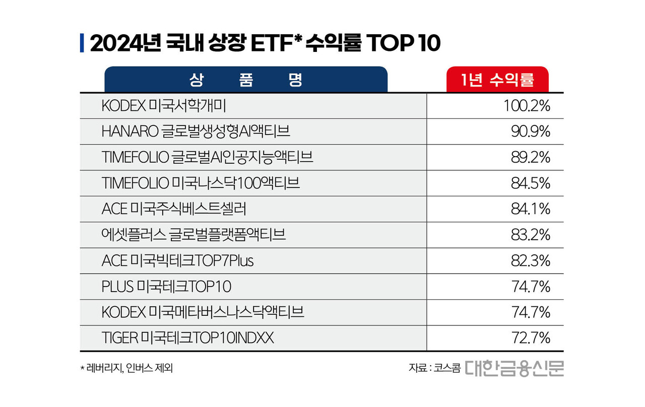 지난해 국내 844개 ETF(인버스·레버리지 제외) 중 삼성자산운용의 ‘KODEX 미국서학개미’가 100.2%의 수익률로 전체 1위를 기록했다.