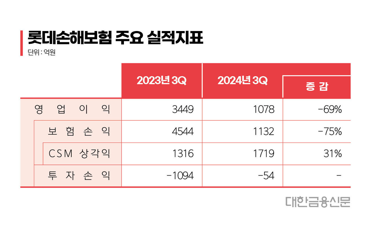 9일 롯데손보에 따르면 지난해 3분기 누적 영업이익은 1078억원으로 전년동기 대비 69.4%(2371억원) 급감했다. 보험영업이익(보험손익)이 같은 기간 3412억원 감소한 게 주 원인이다.