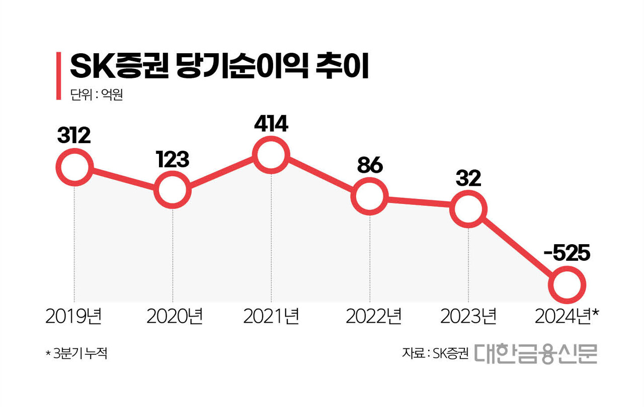 주가 부진 원인은 수익성 악화다. SK증권은 지난 2021년 당기순이익 414억원으로 정점을 찍은 뒤 2022년 86억원, 2023년 32억원으로 줄곧 하락해 왔다. 지난해 3분기 누적 당기순손실은 525억원으로 사실상 연간 적자 전환이 불가피해졌다.