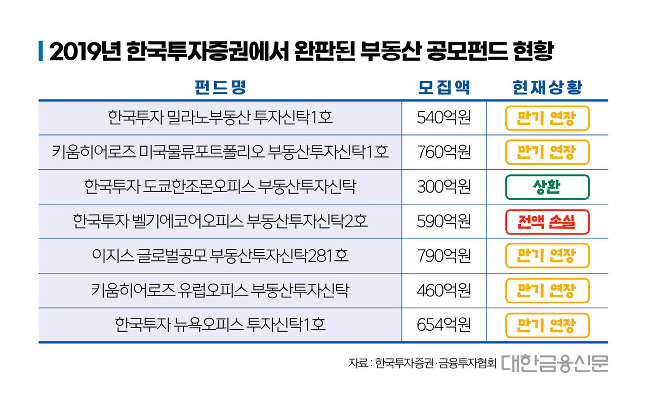 그해 한투증권이 완판시킨 부동산펀드 모집액은 4100억원에 달한다. 이 중 무사히 상환된 펀드는 ‘한국투자 도쿄한조몬오피스 부동산투자신탁’뿐이다. 나머지는 건물 매각 지연으로 만기가 연장되거나 전액 손실 사태에 처했다.