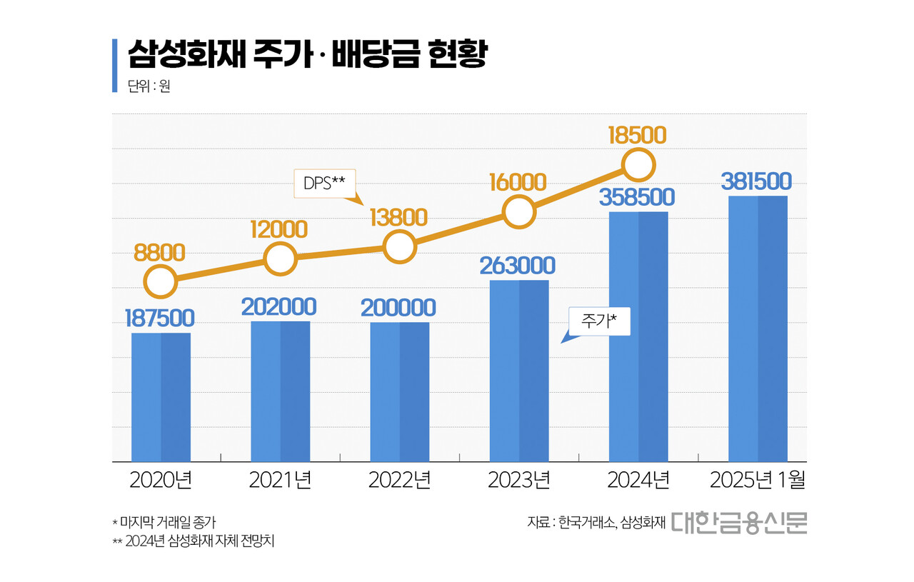 삼성화재는 금융을 넘어 한국 증시를 대표하는 배당 성장주다. 삼성화재는 지난해 말 기준 최근 4년간 주가와 DPS는 각각 91.2%, 110.2% 상승하며 존재감을 과시했다. 밸류업 공시일인 지난 31일에도 11.71% 급등하며 기대감을 키웠다.