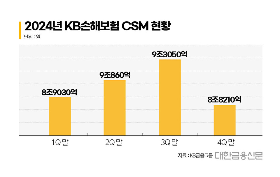 11일 KB금융그룹에 따르면 지난해 말 기준 KB손보의 보유계약 CSM은 8조8210억원로 전분기 말 대비 5.2% 감소했다. 이는 1분기 말(8조9030억원)보다 낮은 수준이다.