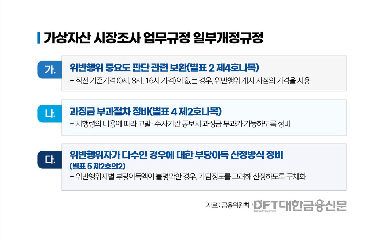 금융위 가상자산과는 “다수가 공동으로 위반행위에 가담하는 등 위반행위자별 부당이득액이 불명확한 경우에도 가담 정도를 고려해 과징금을 부과할 수 있도록 규정을 마련하고자 한다”고 밝혔다.