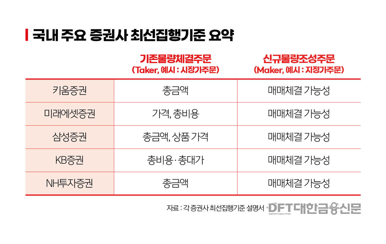 지난해 3분기 누적 기준 수탁 수수료 수익이 가장 많았던 국내 5개 증권사(키움·미래·삼성·KB·NH)의 신규물량조성주문(Maker Order)의 경우 5개사 모두 매매체결 가능성을 최우선 조건으로 지정했다. 지정가 형식이기 때문에 거래가 성립되는 것이 가장 중요하기 떄문이다.