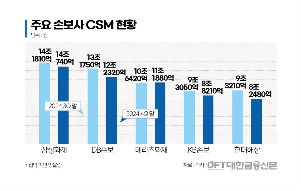 지난해 3분기까지 보유계약 CSM 기준 상위 7개사(삼성화재‧삼성생명‧DB손보‧메리츠화재‧한화생명‧KB손보‧현대해상) 중 2위였던 DB손보는 삼성생명에 밀려 3위로 내려갔다.