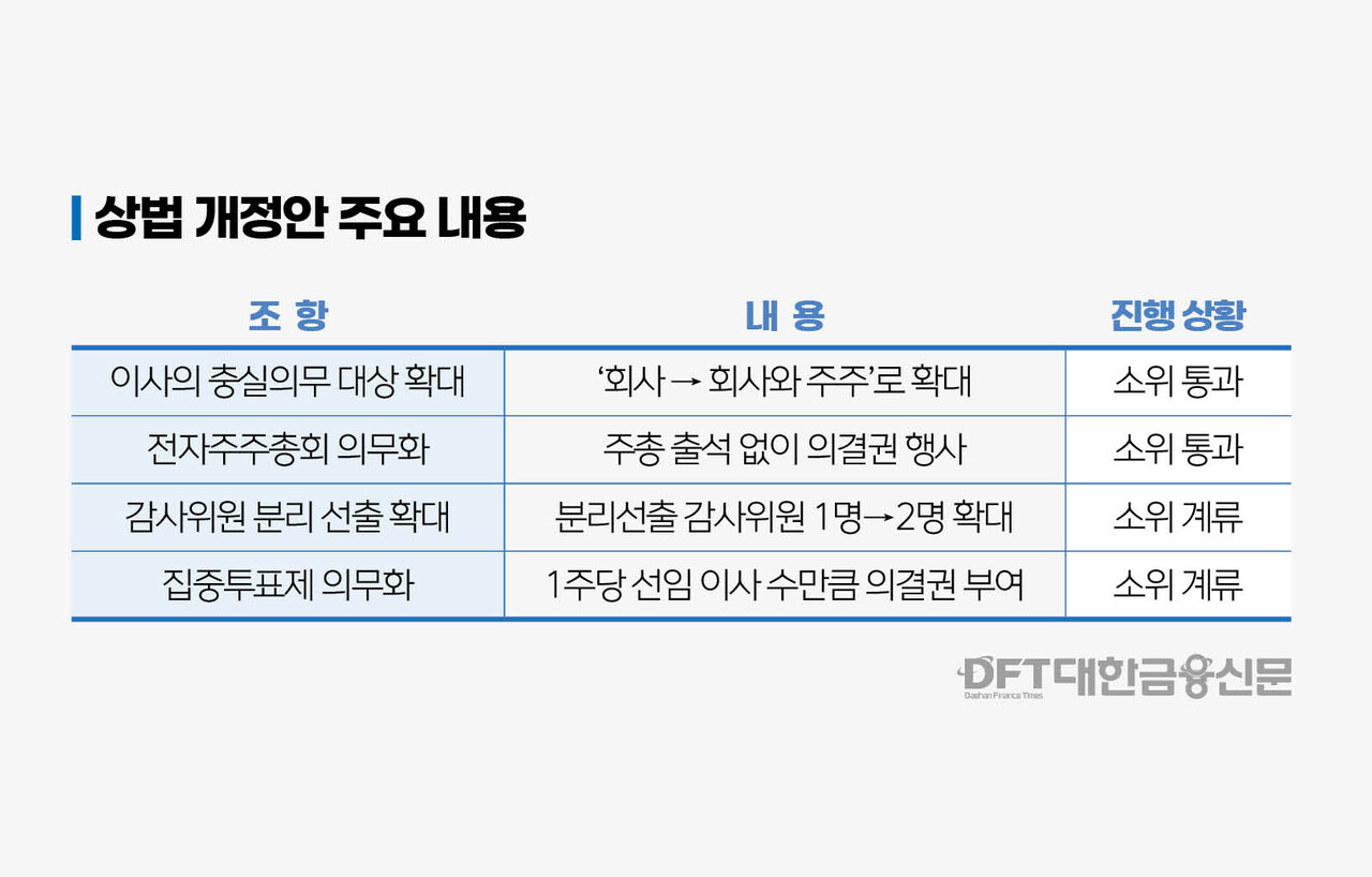상법 개정안은 △기업 이사의 충실 의무 대상을 현행 ‘기업’에서 ‘기업 및 주주’로 확대하고 △일정 자산 규모 이상 상장사의 전자 주주총회 개최를 의무화하는 내용 등을 골자로 한다.