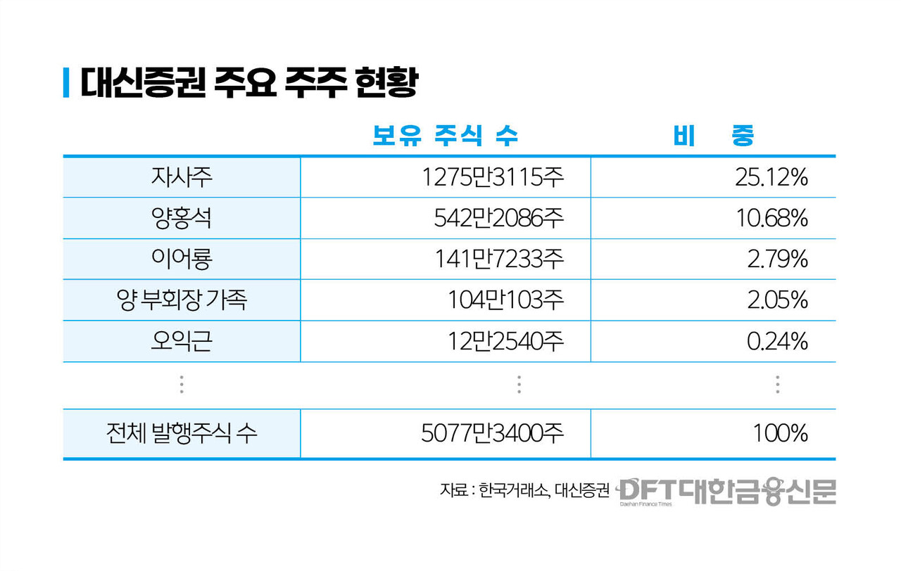 유통 주식 물량에 대입하면 전체 오너가의 지분율은 22.2%까지 늘지만 통상 안정적인 경영권을 확보했다고 여겨지는 30~35% 지분에는 못 미친다. 다만 대신증권이 밸류업으로 자사주를 소각하지 않겠다고 한 만큼 상여 명목의 자사주 지급을 이어갈 시 양 부회장의 지분율은 지속 상승할 것으로 전망된다.