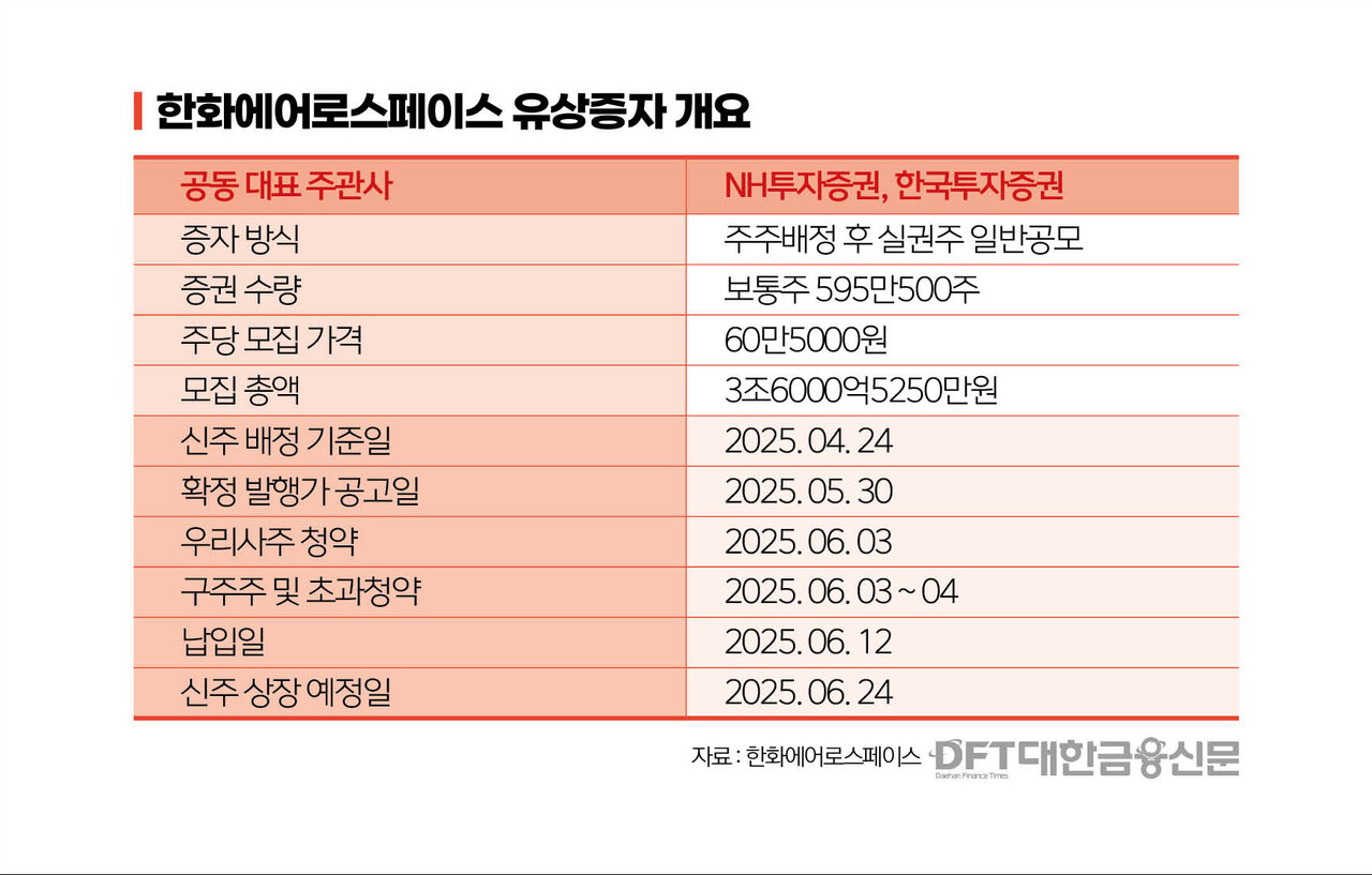 한편 한화에어로스페이스는 다음달 24일 신주를 배정하고 오는 6월 24일 유가증권시장에 신주를 상장할 예정이다. 유증은 ‘주주배정 후 실권주 일반공모’ 방식으로 진행되며 주당 모집 가격은 60만5000원, 모집 총액은 3조6000억5250만원이다. <표 참고>