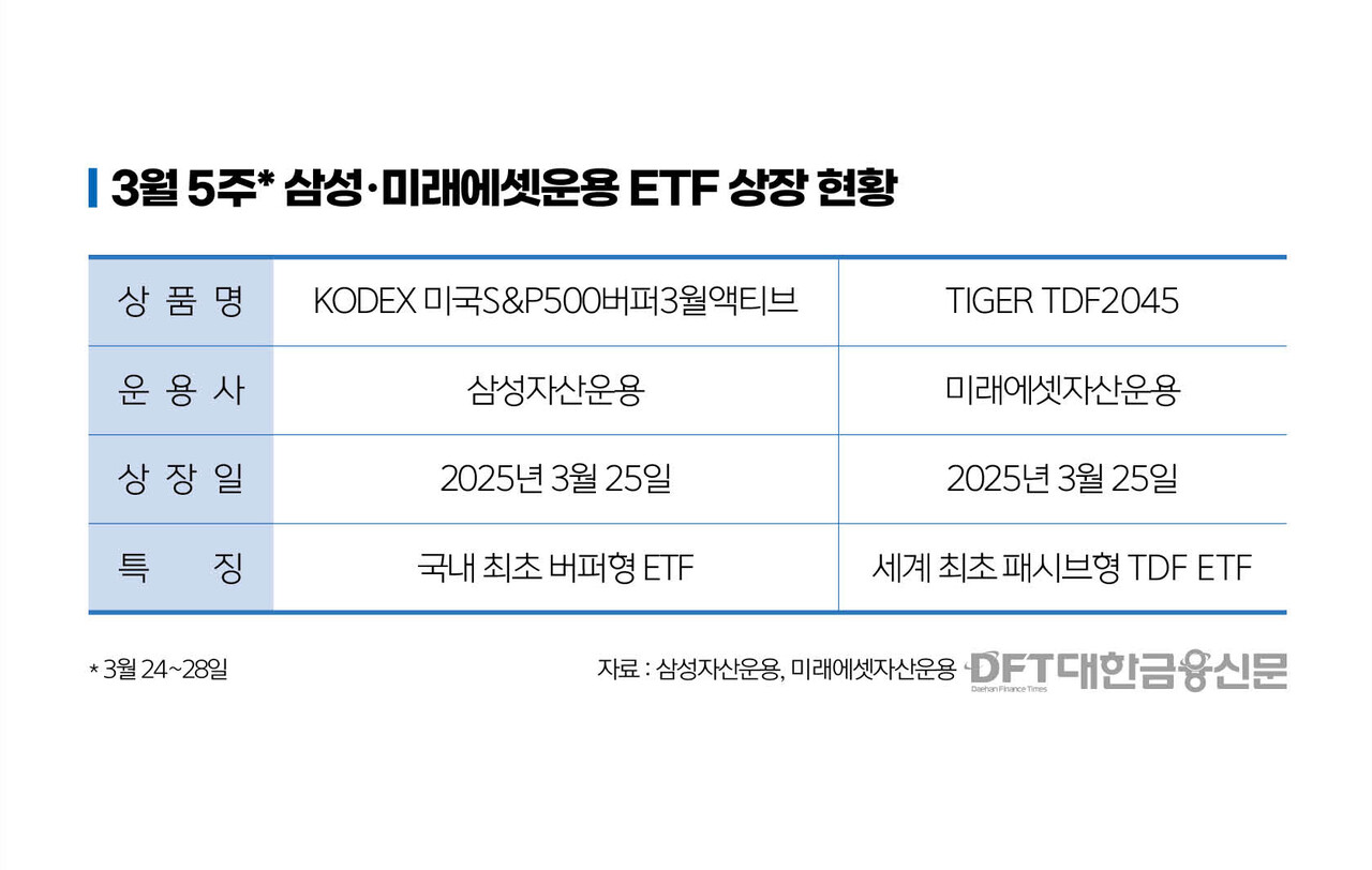 관련 업계에 따르면 지난 25일 삼성운용과 미래에셋운용은 각각 버퍼 ETF와 타겟데이트펀드(TDF) ETF를 국내 시장에 상장했다. 양사 모두 ‘국내 최초’, ‘세계 최초’ 타이틀을 내세우며 투심을 공략하고 나섰다.