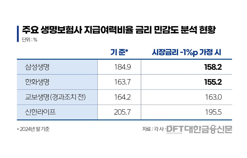 9일 주요 생보 4개사(삼성‧한화‧교보‧신한라이프)의 지난해 결산 정기공시에 따르면 지난해 말 기준 시장금리 1.0%p 하락 가정 시 4개사의 총 가용자본은 1조1770억원 감소한 79조3220억원까지 줄어든다.