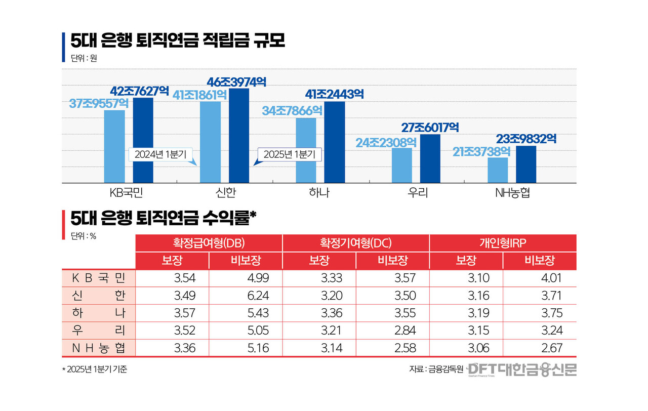 한편, 5대 은행의 1분기 원리금 비보장 상품 평균 수익률은 △DB형 5.37% △DC형 3.21% △개인형IRP 3.48%로 집계됐다. 이는 지난해 4분기 수익률인 △DB형 6.60% △DC형 10.19% △IRP 9.68%와 비교하면 전반적으로 낮아진 수치다.