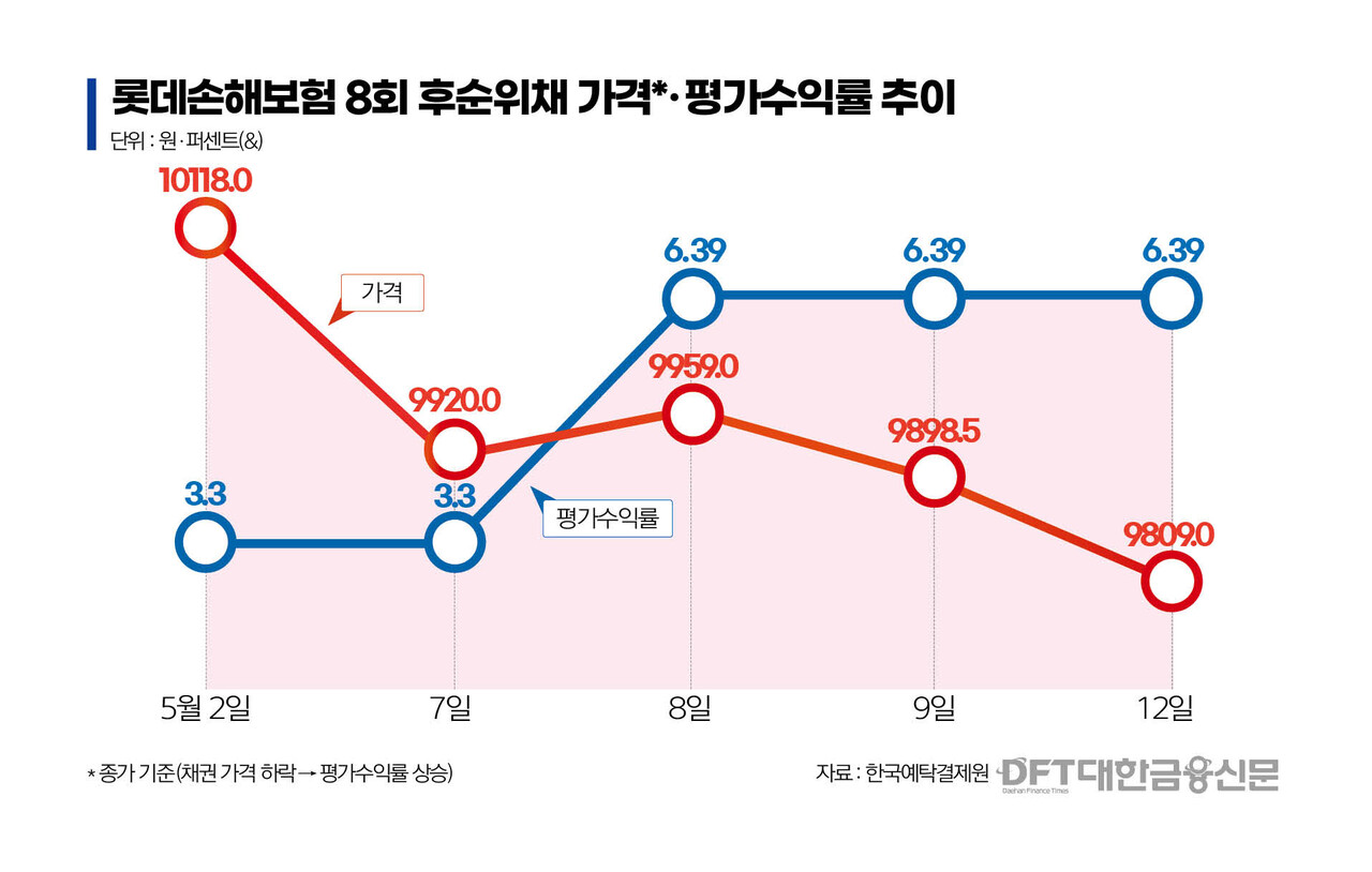 롯데손해보험이 8회 후순위채의 조기상환권(콜옵션) 이행을 연기하면서 해당 후순위채 평가수익률이 치솟고 있다. 개인·기관 할 것 없이 불안심리를 느낀 투자자들이 매도에 나섰기 때문이다.
