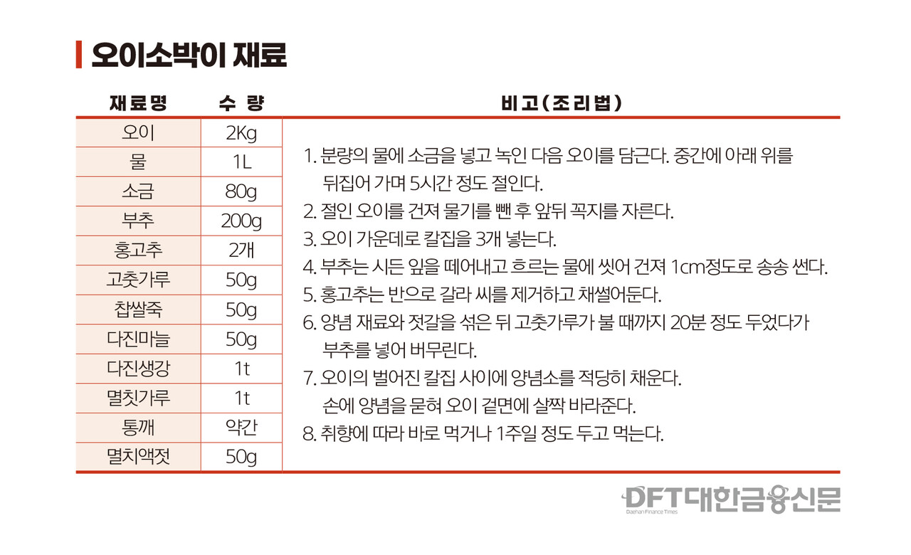 오이와 열무는 대표적인 여름 김치 소재다. 오이는 5시간 정도 절이는데, 중간에 위아래를 뒤집어준다. 물기를 뺀 후 앞뒤 꼭지를 자르고 오이 가운데 칼집을 내준다. 오이와 가장 잘 어울리는 부재료는 부추다. 부추는 시든 잎을 떼어내고 흐르는 물에 씻어 1cm 크기로 썬다. 홍고추는 색을 위해 넣는데 반을 갈라 씨를 제거하고 채 썰어둔다.