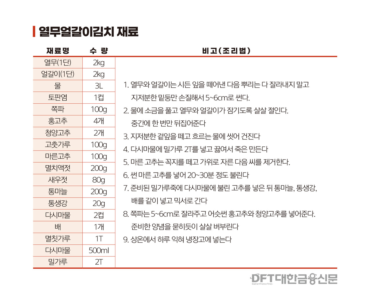 젖산 발효를 도와줄 밀가루 풀을 쑨다. 다시마 물 500ml에 밀가루 2큰술을 넣고 끓여 식히면 된다. 풀이 다 되면 앞서 준비한 고추와 통마늘, 통생강, 배를 같이 넣고 믹서에 간다. 씻어놓은 쪽파는 5~6cm로 잘라주고 어슷하게 썬 홍고추와 청양고추도 넣어준다. 이제 준비한 양념을 묻히듯이 살살 열무 얼갈이와 함께 섞어 버무리면 완성이다. 완성된 김치는 하루 정도 상온에 둔 뒤 냉장고에 넣으면 된다.