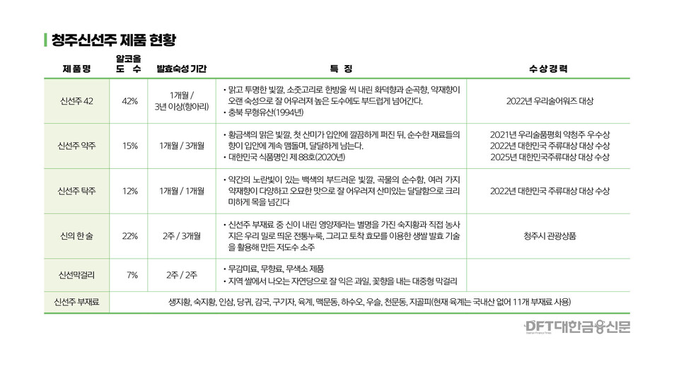 현재 박준미 명인이 빚고 있는 술은 모두 5종이다. 무형유산으로 등재된 신선주(증류식 소주 42%) 이외에 신선주 약주와 탁주를 만들어왔다. 지난해부터는 알코올 도수를 낮춰 범용적으로 소비할 수 있도록 만든 ‘신의 한 술(22%)’을 생산하고 있으며, 알코올 도수를 7%로 낮춘 ‘신선막걸리’도 조만간 출시할 예정이다.