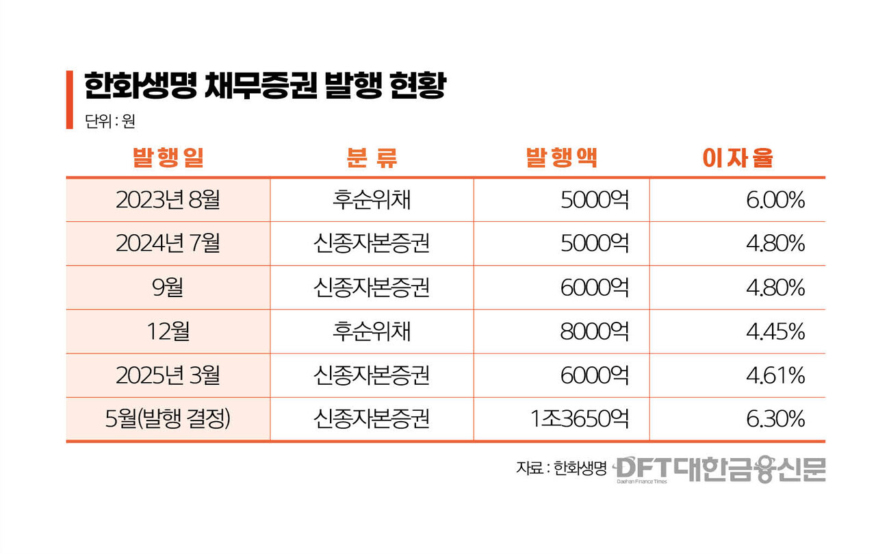 문제는 비용이다. 이번에 발행한 해외 신종자본증권의 연간 이자비용은 약 859억원으로 추산된다. 한화생명은 새 보험회계기준(IFRS17)이 도입된 2023년 이후 후순위채와 신종자본증권을 통해 약 3조원의 자본을 조달했는데, 이에 따른 평균 부담 이자율은 4.9%에 달한다. 이번 신종 발행과 기발행 증권을 모두 더하면 연간 이자비용은 2320억원에 이른다.
